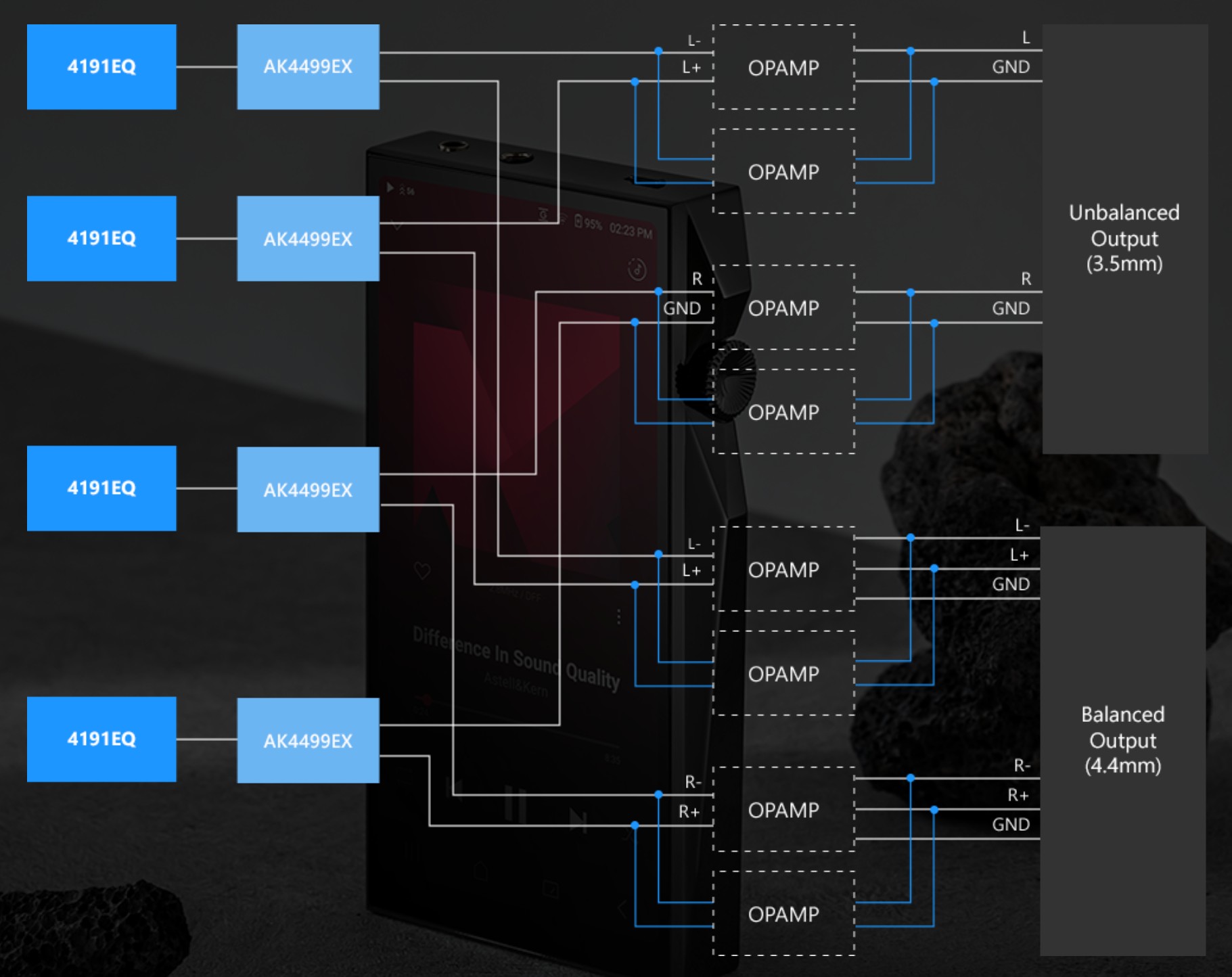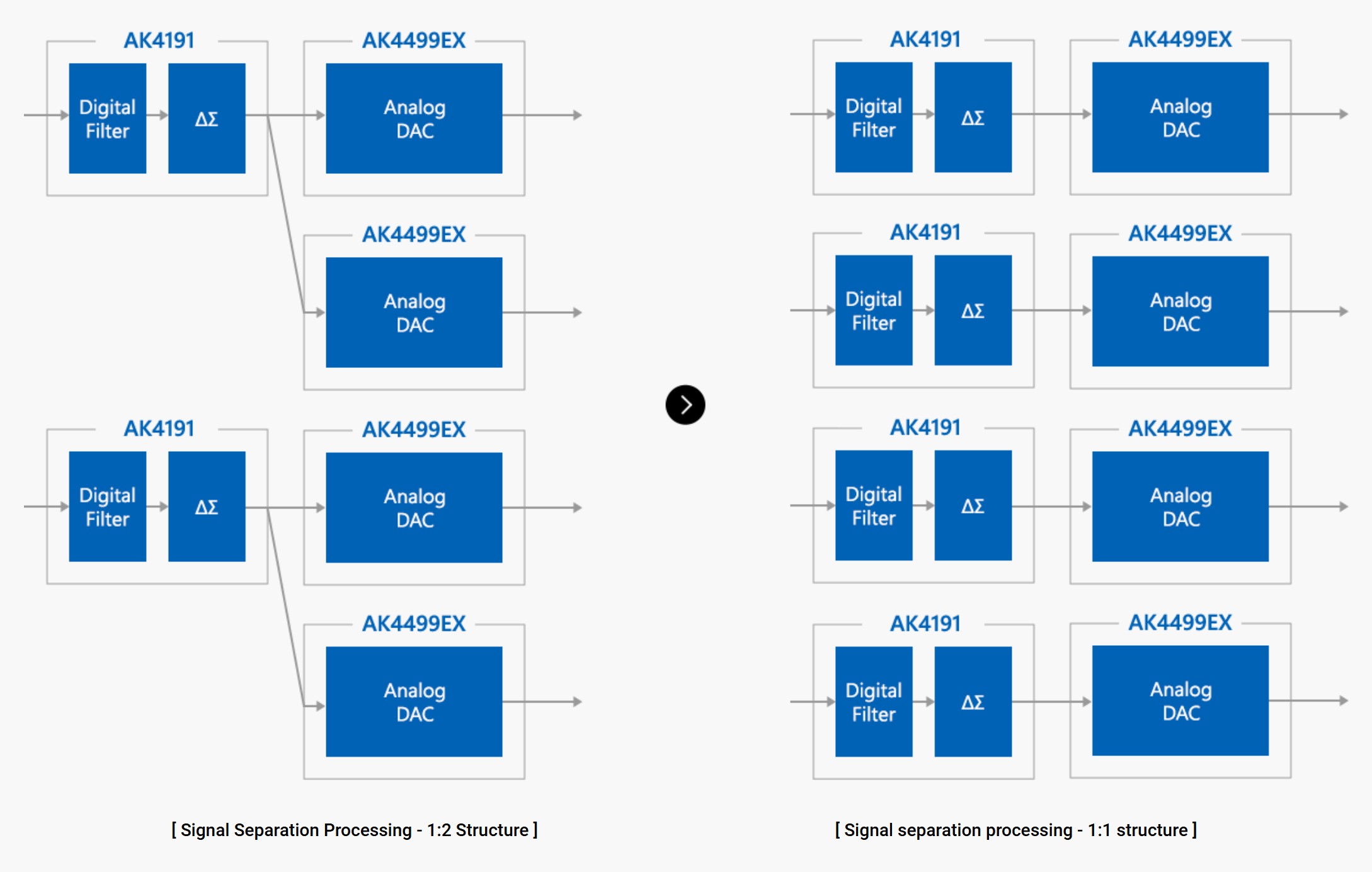 SP3000ではデジタルとアナログの信号処理構成を1:2の割合で分離していましたが、SP4000では1:1のアーキテクチャーに進化しました。AK4191EQとAK4499EX DACが1対1の状態で4基搭載した、真のQuad DAC構成となる独自のOCTAオーディオ回路構造採用により、信号処理能力を大幅に強化。AK4191EQデジタルプロセッサー1基とAK4499EX DAC 1基が対になるこの新構造により、ノイズを分散させることなく、デジタル信号を1つのDACに対し正確に届けることができ、信号の分離と処理の向上が可能になりました。その結果、従来の独立デュアルオーディオ回路に匹敵する131dBという驚異的なS/N比を実現しました。