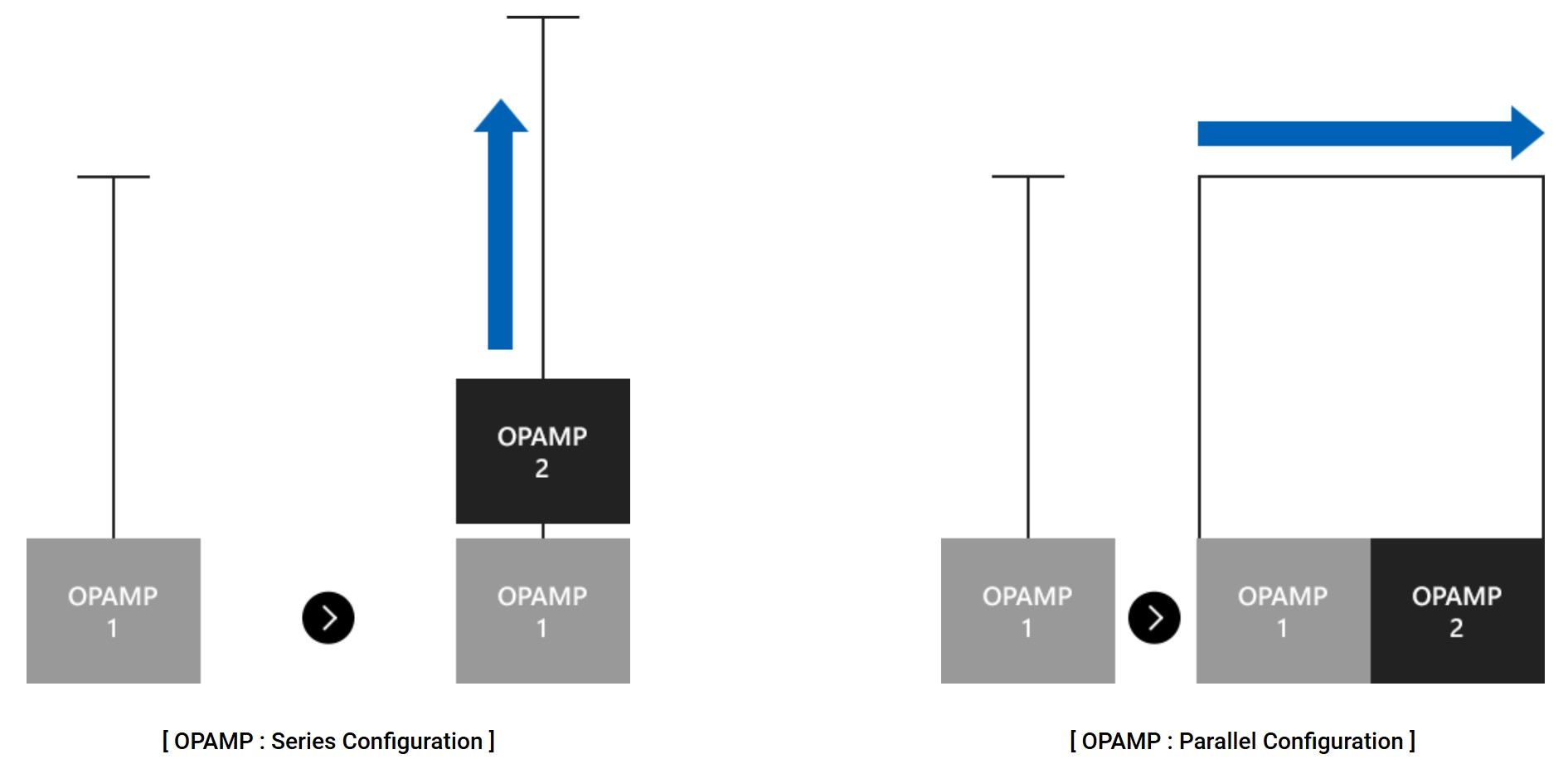 駆動範囲は直線的に広がりますが、ノイズの増加やS/N比が低下します。音に力強さを感じる反面、荒々しさやキツさが増える傾向があります。[並列配置のOP AMP構成]