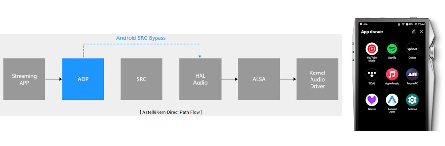 ストリーミングを中心とした音楽再生へのシフトが進む中、SP4000はAstell&Kern初のFull Android OSを採用しました。フラッグシップの高音質を実現するだけではなく、アプリを自由にインストールすることができることで利便性も向上させ、次世代デジタルオーディオプレーヤーとして進化を遂げています。そして独自のカスタマイズ技術ADP(Astell&Kern Direct Path)により、Android OSのサンプリング制限(SRC)を克服しました。これにより、ストリーミング環境においてもビットパーフェクトなロスレス再生を可能にしました。