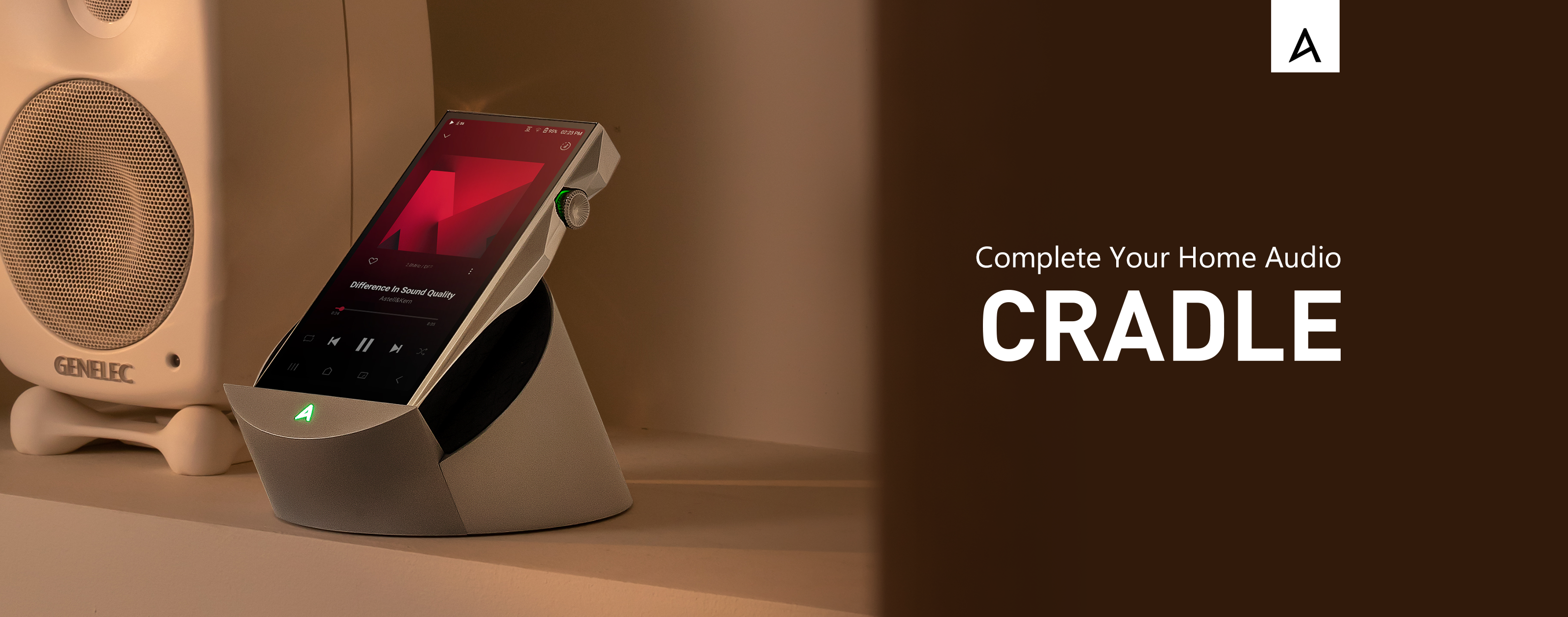 AK CRADLEのデザインは、最も完全な幾何学的形状である「円」から着想を得ています。サイズに対する面積が最大となる形状である円は、様々な体格のDAPに安定したサポートを提供すると同時に、ポータブルオーディオからホームオーディオへの拡張を象徴しています。円と直線の相互作用が生み出す造形は、斜めに切断された円筒を思わせ、デバイスの安定設置と快適な視聴角度を両立させます。前面に配された「A」ロゴはAstell&Kernのアイデンティティを示すだけでなく、オーディオ情報を視覚的に反映しています。押出成形アルミニウム製のクレードルは、デスクやテーブル上で快適に操作できるよう50度の傾斜角度で設計されています。スライド式ポートシステムにより、DAPサイズやモデルとの互換性を高めています。デバイスとシームレスに融合するAK CRADLEは、空間に自然に溶け込むオブジェとなり、デザイン要素であると同時に、ホームオーディオシステムの真の「コントロールタワー」としての役割を果たします。