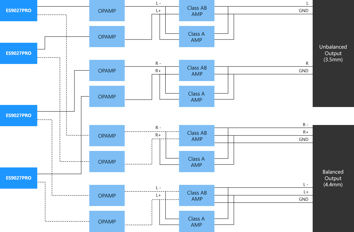 音質に徹底的に拘って設計されたPD20は、心臓部となるDACにESS ES9027PROを4基使用したQuad DAC構成で採用しています。4つのDACが独立して動作することで、チャンネル間の干渉を最小限に抑え、正確な信号分離を実現します。それにより音の微細なニュアンスまでもがより鮮明に再現され、クリーンで歪みのない音層の重なりを通じて、自然でアナログのような音質を創り出します。◆オーディオブロック図